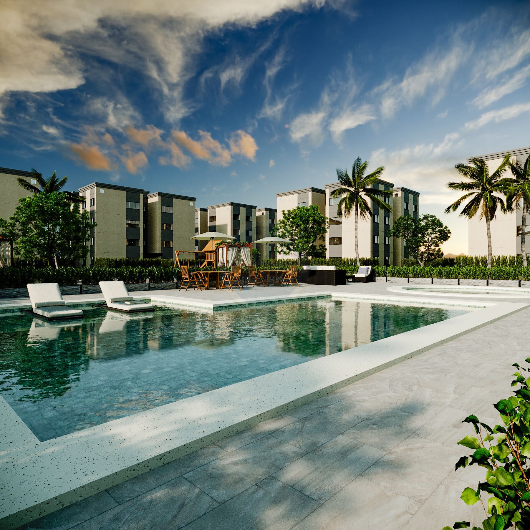 Apartamentos em condomínio fechado com piscinas, quiosques com churrasqueira, pista de caminhada, academia ao ar livre, salão de festas, quadra poliesportiva e muito mais!