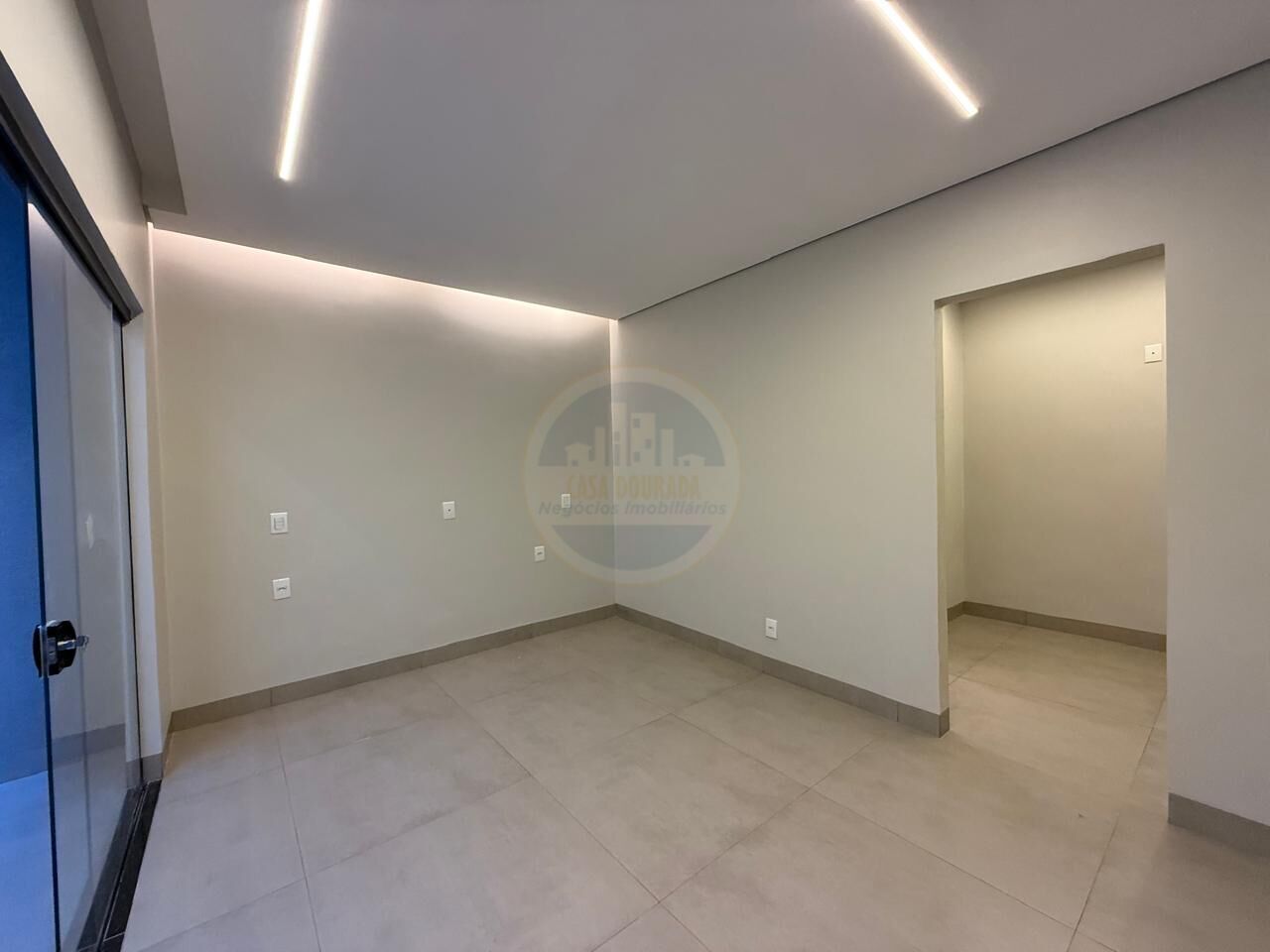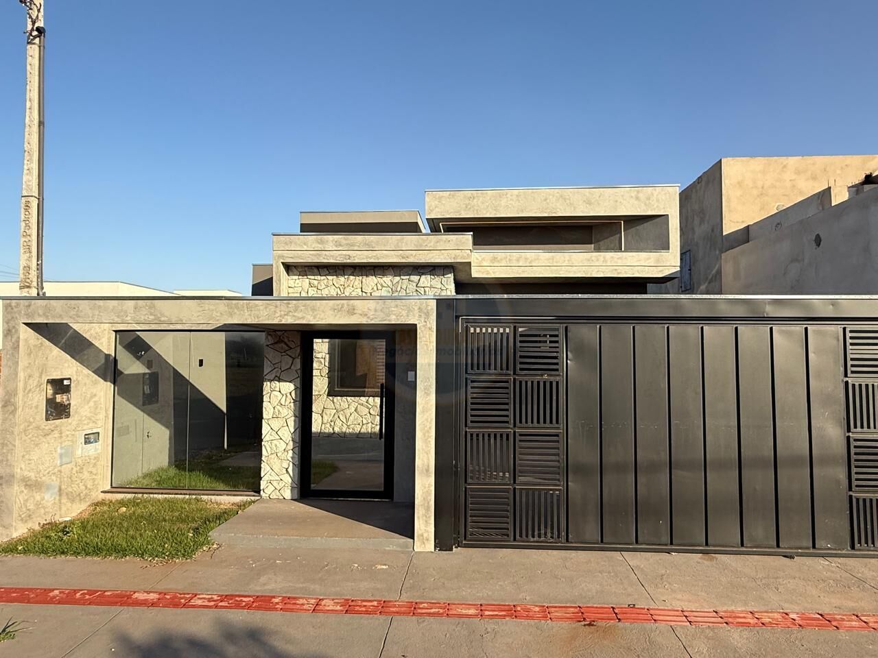 O destaque fica para a porta de entrada estilo ripada em metal, do piso ao teto, que confere sofisticação e imponência ao acesso principal. A sala e os ambientes integrados oferecem excelente iluminação natural, reforçando a sensação de amplitude e conforto.